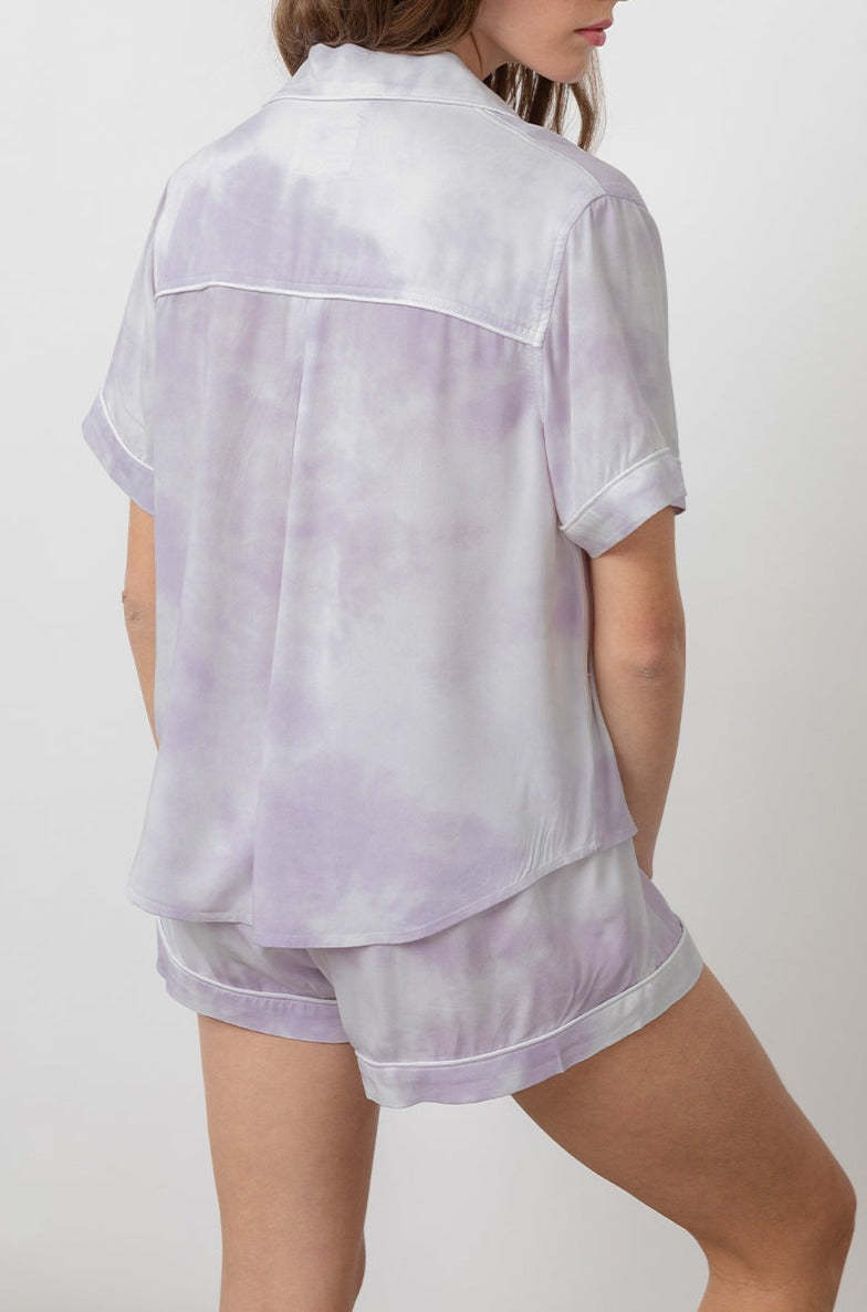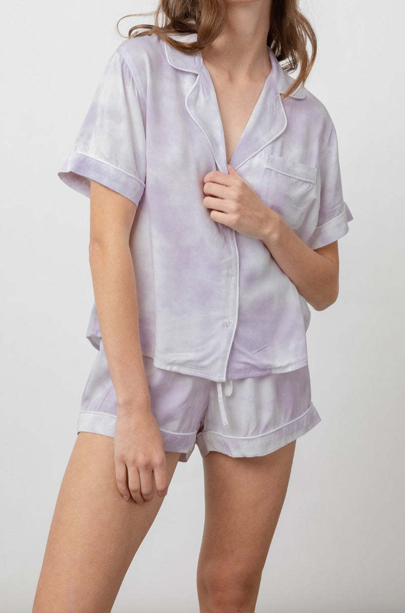 Super cozy, lightweight rayon, soft ivory pajama set with short sleeve buttondown shirt and elastic waist drawstring shorts featuring lavender purple tie dye throughout, pajama style notched collar, patch pocket at chest, white piping trim, and relaxed fit. Made from our signature ultra soft RAILS rayon blend fabric with a loose twill weave, this is stylish sleepwear you will want to live in all day long.