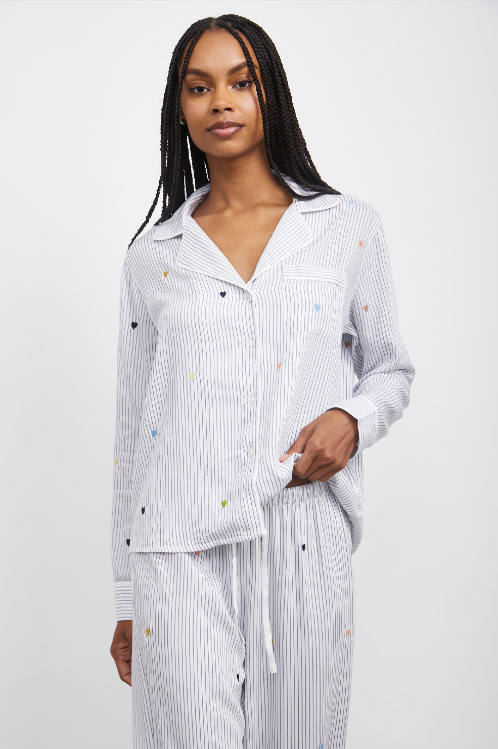 Made from our signature ultra soft RAILS rayon fabric with a loose twill weave, this is stylish sleepwear you will want to live in all day long. The long sleeve button-down top features a single patch pocket at chest, pajama style collar and a relaxed fit. These cozy pants feature an elastic waistband and drawstring for added comfort.
