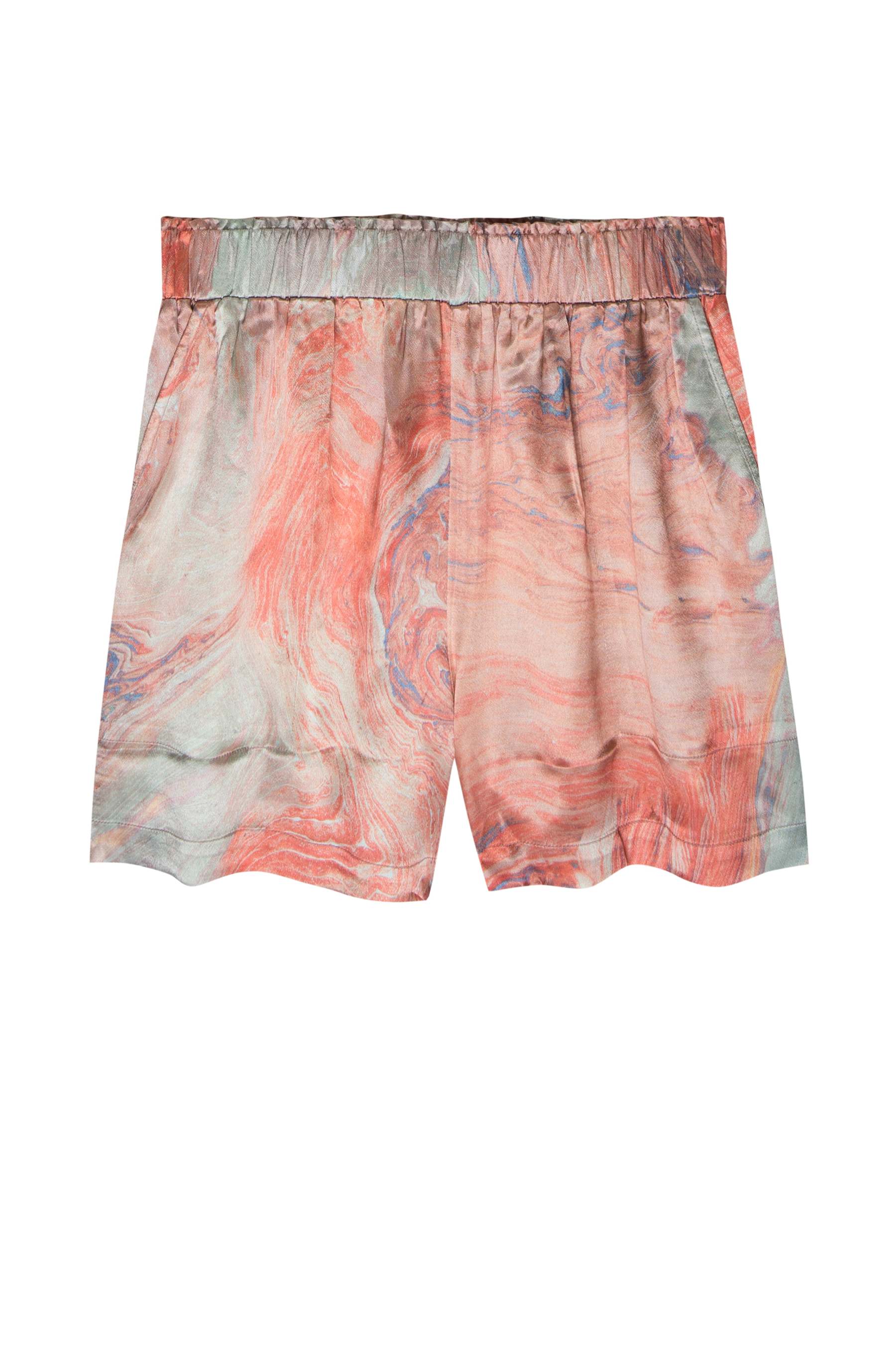 Super smooth, satin crepe, high rise, unlined, sunburst orange shorts featuring warm, natural toned diffused marble print throughout, elastic waistband, relaxed fit, front pockets, and wide leg. Made with luxurious fabric in an easy pullover silhouette, this tank top is perfect for any occasion.