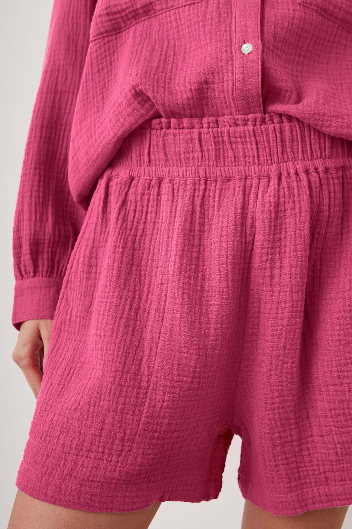 The Leighton Short is a laidback silhouette made with 100% organic cotton gauze that's designed to keep you comfortable. Done in pink, the pair is cut for a relaxed FIT | with a high rise, pull-on waist, and side pockets. A smocked waistband completes the classic short.