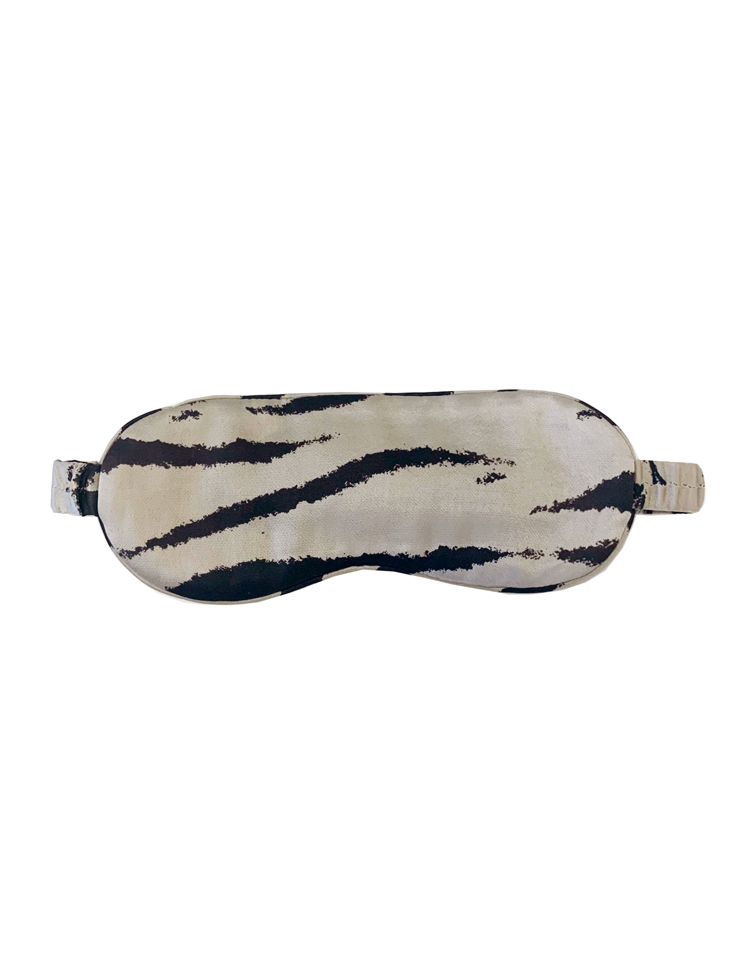 Luxe satin crepe, cool beige eye mask featuring black painterly tiger stripe print throughout and satin-covered elastic band. Rest easy with this chic sleep mask made with silky smooth, cool-to-the-touch fabric, perfect for home or travel.