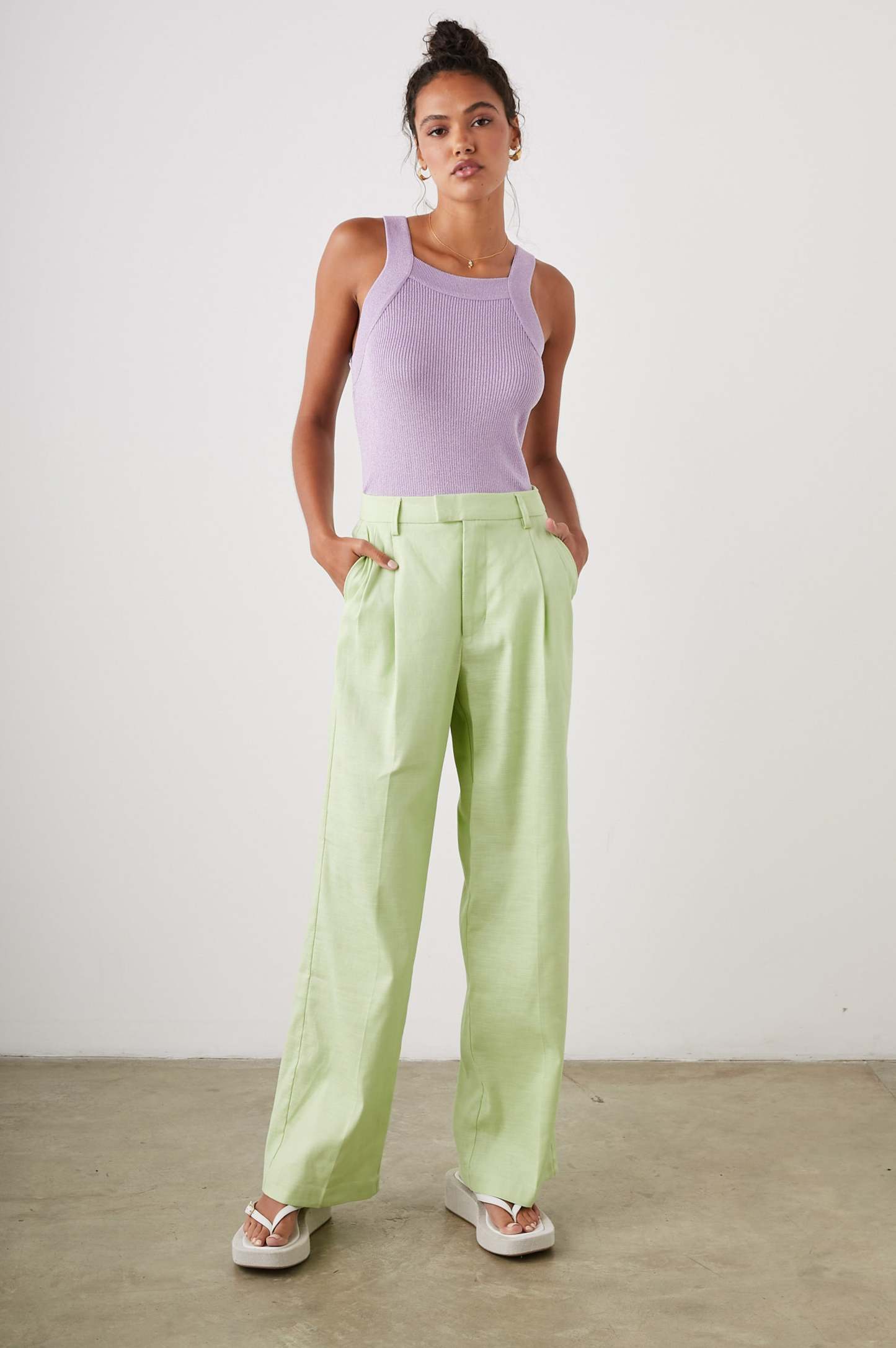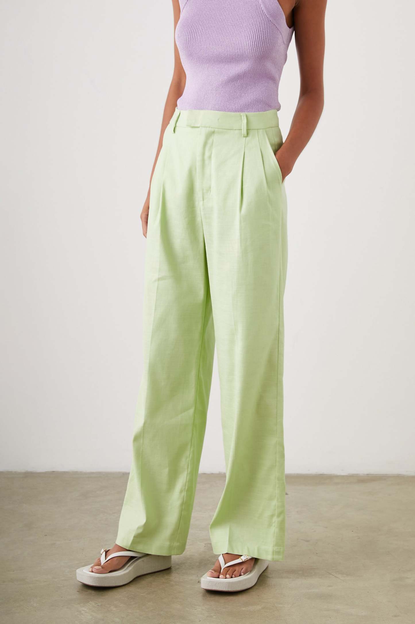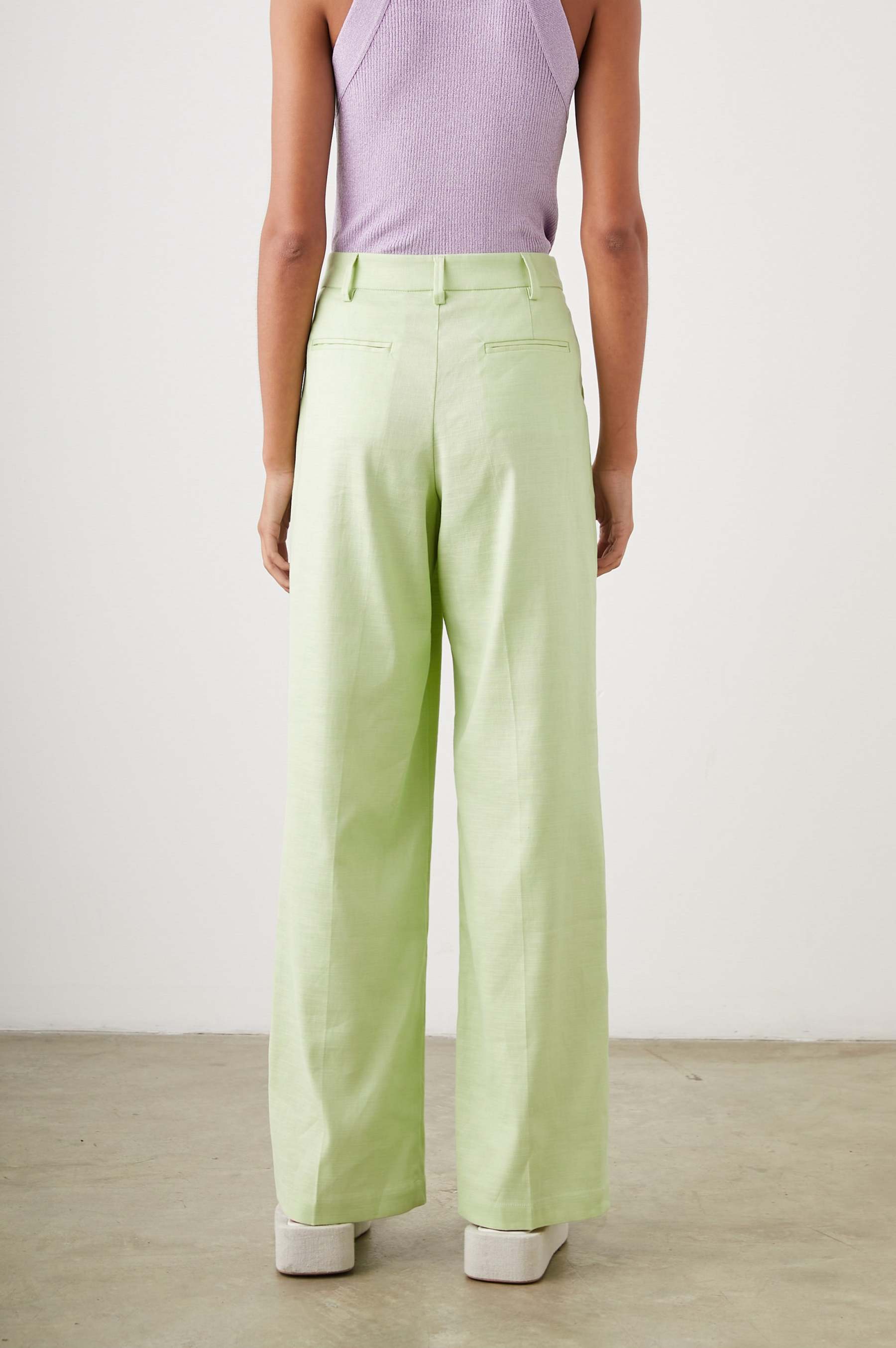Equal parts tailored and relaxed, the Marnie Pant is versatile enough for everyday wear or special occasions. Crafted from heavyweight linen, these green apple-colored trouser pants have a structured look with an exceptionally soft, worn-in feel. Premium features include a concealed hook and bar closure and flattering slit pockets at the back.