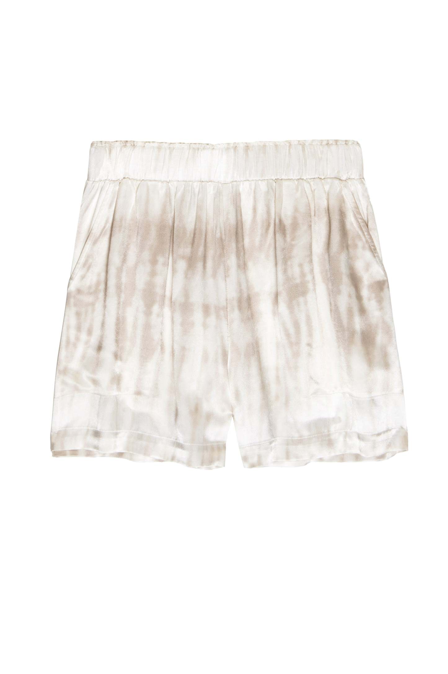 Luxe satin crepe, high-rise, unlined, sleek ivory relaxed shorts featuring sand tan tie dye waves design throughout, elastic waist, front pockets, wide leg, and smocked waistband for easy pull on style. This luxe lounge style made with silky smooth, cool-to-the-touch fabric in an effortless body shape is perfect for relaxing at home or going about your day in the most comfortable fashion possible.