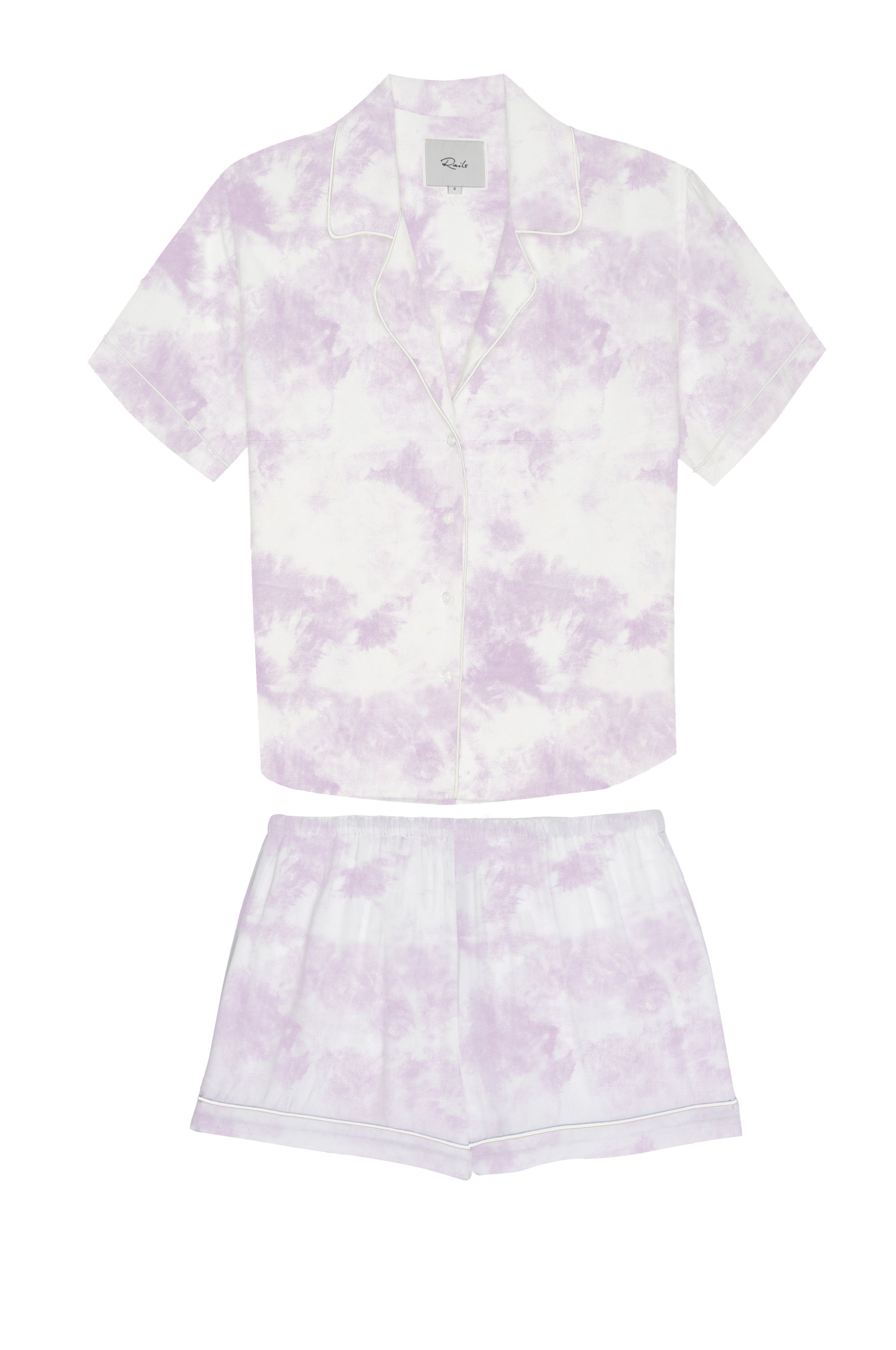 Super cozy, lightweight rayon, soft ivory pajama set with short sleeve buttondown shirt and elastic waist drawstring shorts featuring lavender purple tie dye throughout, pajama style notched collar, patch pocket at chest, white piping trim, and relaxed fit. Made from our signature ultra soft RAILS rayon blend fabric with a loose twill weave, this is stylish sleepwear you will want to live in all day long.