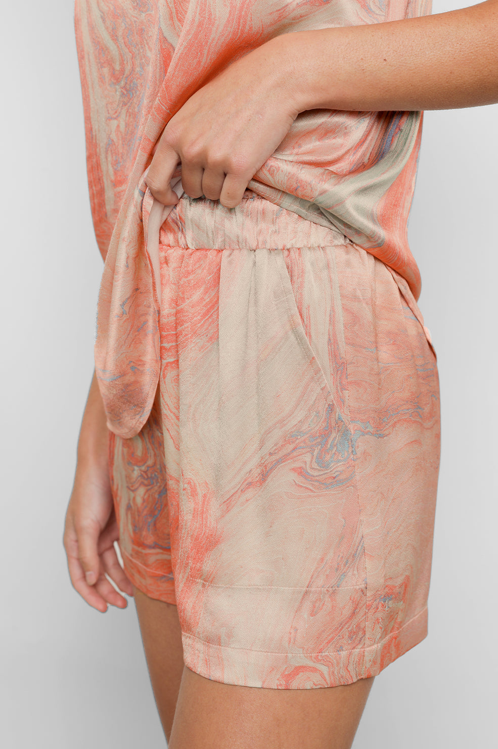 Super smooth, satin crepe, high rise, unlined, sunburst orange shorts featuring warm, natural toned diffused marble print throughout, elastic waistband, relaxed fit, front pockets, and wide leg. Made with luxurious fabric in an easy pullover silhouette, this tank top is perfect for any occasion.