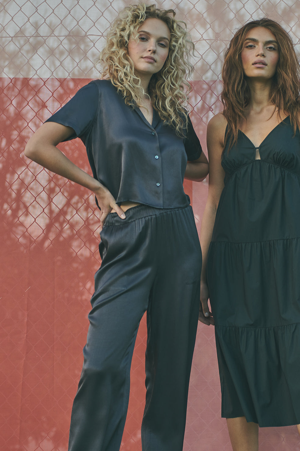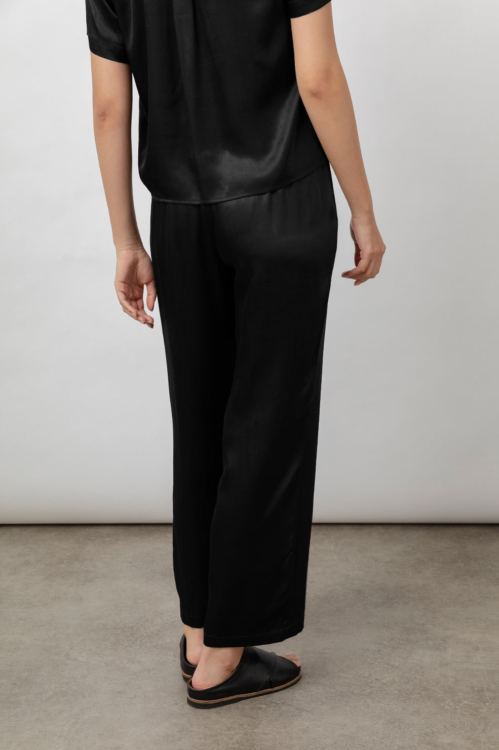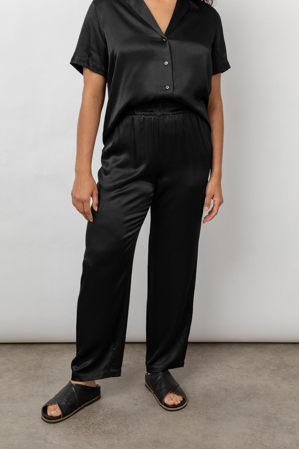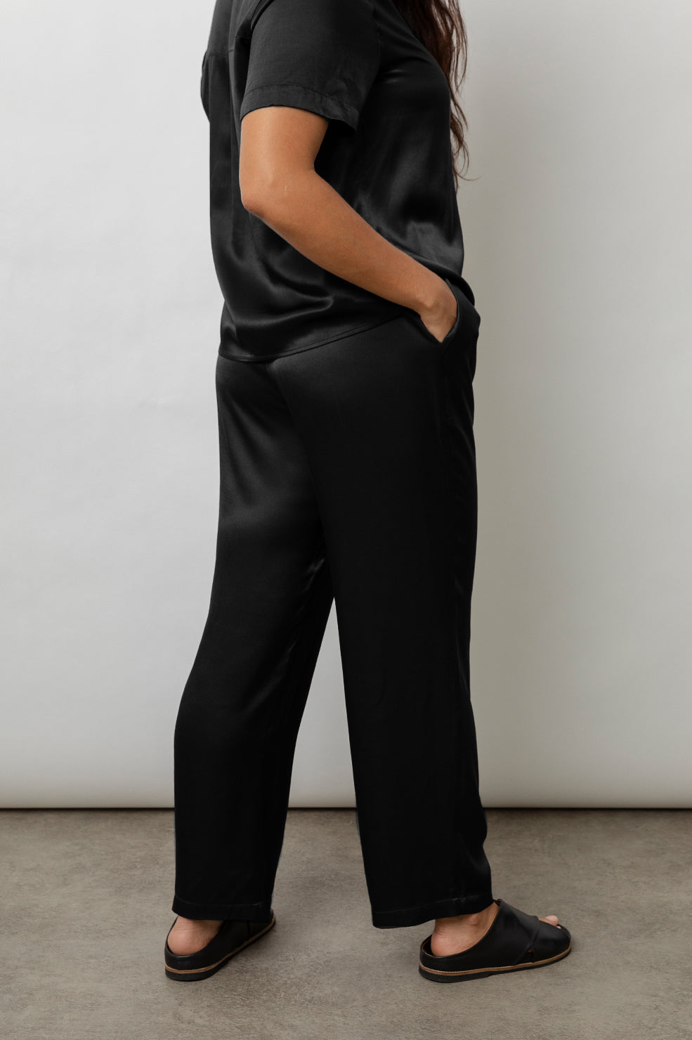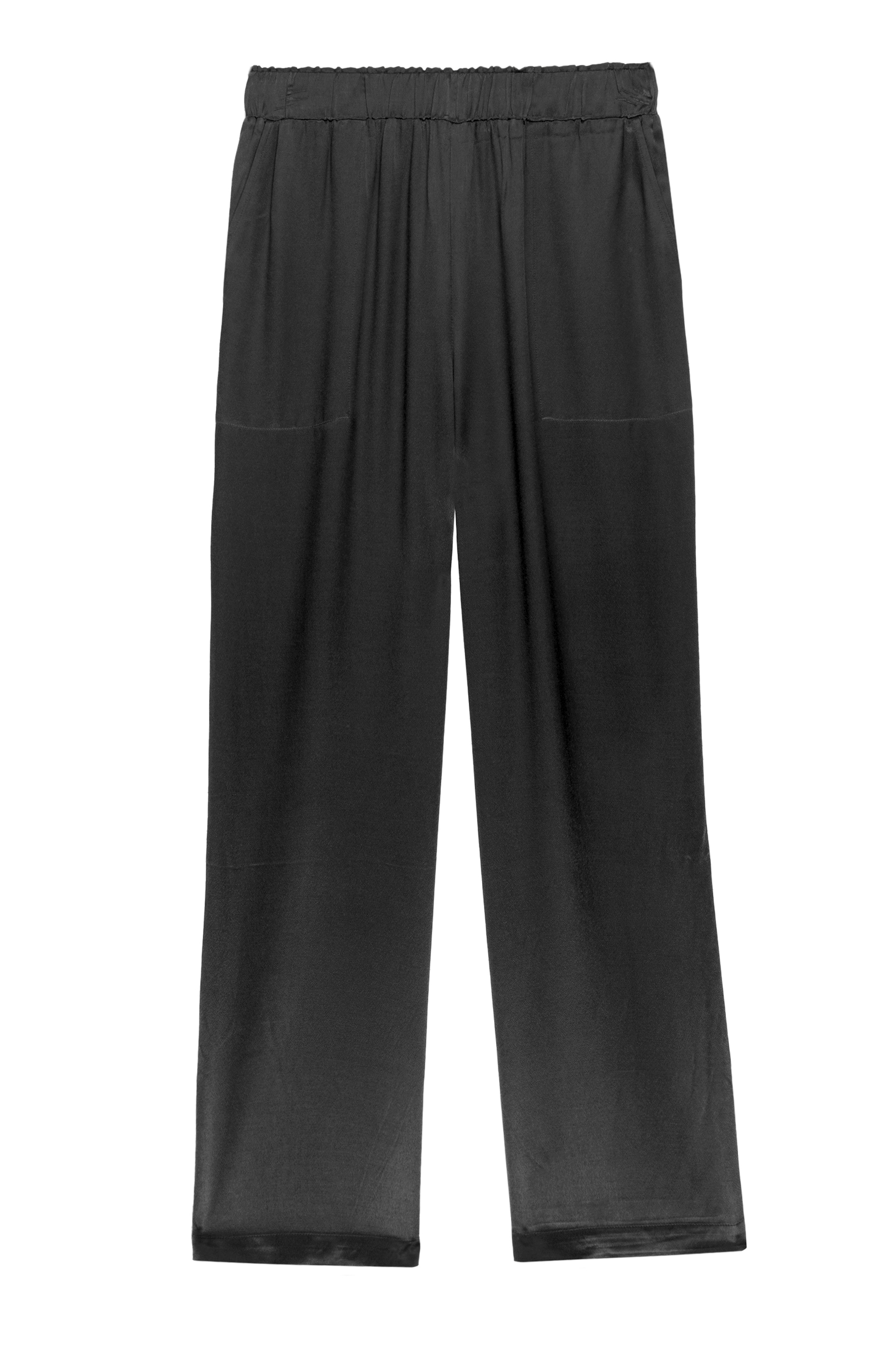 Luxe satin crepe, adjustable-rise, unlined, slate grey relaxed pants featuring elastic waist, front pockets, straight leg, ankle-length inseam, and smocked waistband for easy pull on style. This luxe lounge style made with silky smooth, cool-to-the-touch fabric in an effortless body shape is perfect for relaxing at home or going about your day in the most comfortable fashion possible.